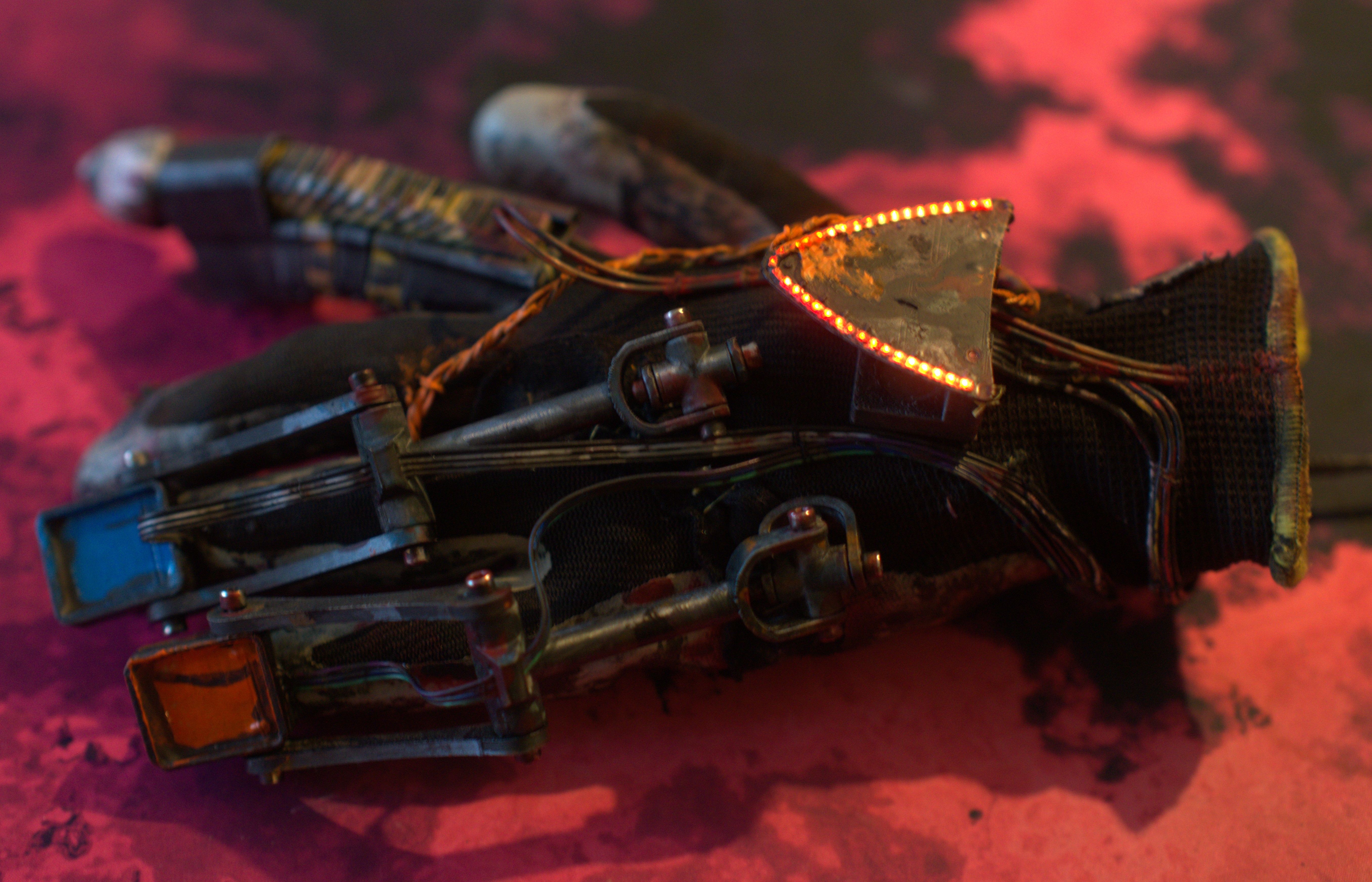 An own build glove has LED, which can be animated and remotely controlled using http. The glove has also a switch, which sends out OSC messages for triggering animations.